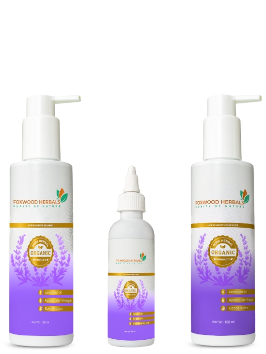 Foxwood Herbals Anti-Dandruff Shampoo, Conditioner, and Toner are a 3-in-1 herbal solution that eliminates dandruff, soothes scalp irritation, and strengthens roots. Enriched with Lavender Oil, Witch Hazel Extract, Bergamot Oil, Apple Cider Vinegar, Soya Protein, and Cocoa Butter, this sulfate- and paraben-free formula gently cleanses, nourishes and restores balance to your scalp, leaving hair healthy, flake-free, and revitalized. Suitable for all hair types and ideal for daily use.